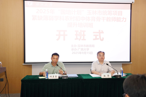 为深入贯彻落实国家关于新时代教师队伍建设改革的决策部署,提升农村初中体育骨干教师的专业能力与综合素养,2025年9月15日,由玉林市教育局统筹、广西大学承办的2025年“国培计划”玉林市统筹项目——紧缺薄弱学科农村初中体育骨干教师能力提升培训班在我校开班,玉林市教育局办公室主任、教师工作科负责人何勇坚和米兰体育副院长徐华出席开班式并讲话,米兰体育副教授范小俊主持开班式。